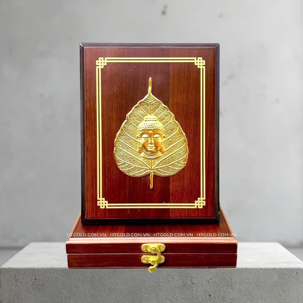 Tranh lá Bồ đề Đức Phật, dát vàng, kích thước phủ bì 17cm x 22cm của thương hiệu HT-Gold được chế tác thủ công bởi những người thợ tài hoa, nhiều năm kinh nghiệm, sử dụng những chất liệu kim loại đồng vàng, bề mặt tranh được dát một lớp vàng mỏng tạo nên sắc vàng sáng lấp lánh bền màu cùng thời gian. Chính giữa lá bồ đề là hình ảnh Đức phật uy nghi thể hiện sự tôn nghiêm và ý nghĩa phong thuỷ của lá bồ đề.