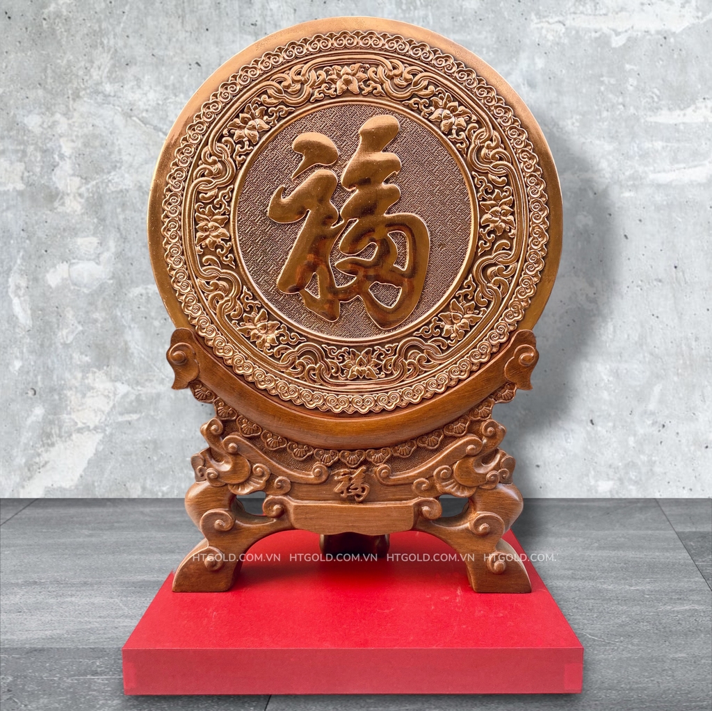 Bức tranh chữ Phúc (hán) bằng đồng đỏ, loại tranh để bàn có đường kính 30cm, tổng chiều cao bao gồm cả chân đế là 42cm được chế tác từ nguyên liệu đồng đỏ nguyên tấm nhập khẩu Hàn Quốc. Chính giữa bức tranh là chữ Phúc (hán) được thúc nổi sắc nét, cứng cáp rất sang trọng, có sức cuốn hút đặc biệt, các họa tiết hoa văn khung viền tranh tạo nên sự cân đối, hài hòa, từng đường nét được chạm khắc tinh xảo. Tranh đồng chữ Phúc (Hán) được chế tác thủ công bởi nghệ nhân có kinh nghiệm lâu năm, lại sử dụng chất liệu cao cấp nên bức tranh có độ tinh xảo cao.
