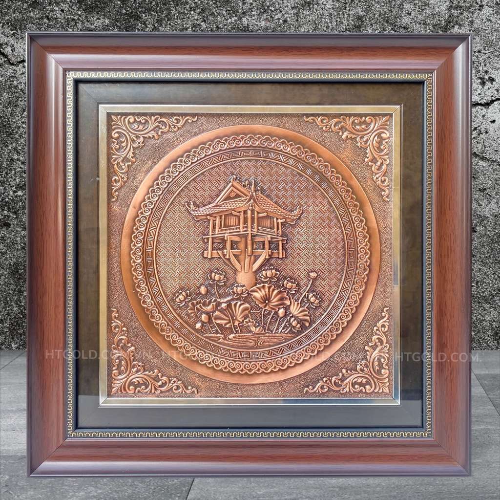 Tranh đồng Chù Một cột bằng đồng đỏ giả cổ của HTgold được chế tác từ tấm đồng đỏ nguyên chất từ bàn tay chế tác của những người thợ tài hoa của Làng nghề chạm bạc Đồng Xâm.
