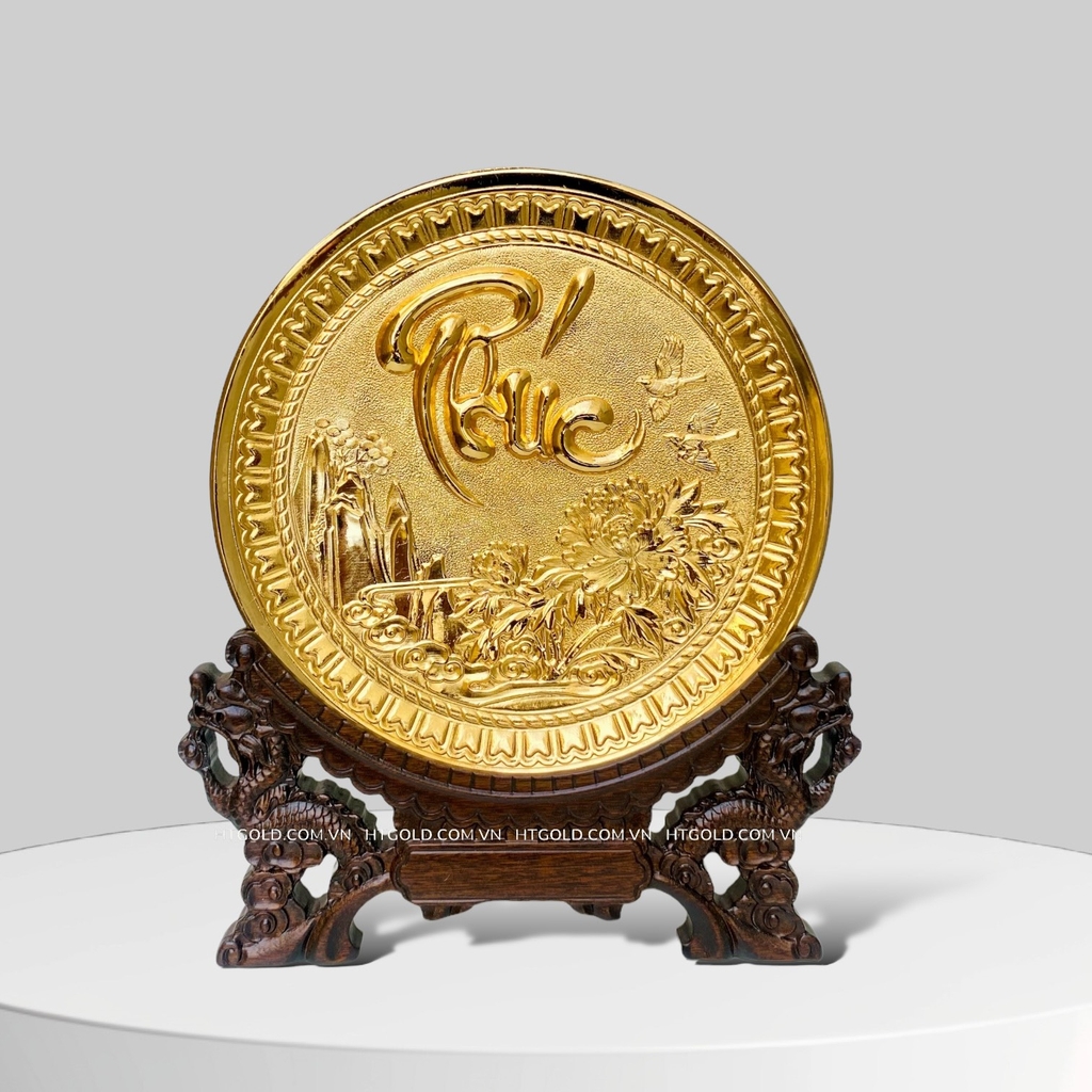 Bức tranh đĩa chữ Phúc mạ vàng của HT-Gold đường kính 19cm được chế tác thủ công bởi những nghệ nhân làng nghề chạm bạc Đồng Xâm có tay nghề cao nhiều năm kinh nghiệm. Người nghệ nhân đã thể hiện các nét thanh nét đậm vô cùng khéo léo, các hoa văn được chạm tỉa sắc nét, từng cánh hoa, lá, cành được thể hiện sinh động. Bức tranh đĩa chữ Phúc thư pháp với phần chữ được viết một cách mềm mại và uyển chuyển, mạ vàng 24k tạo nên độ lấp lánh khó rời mắt.