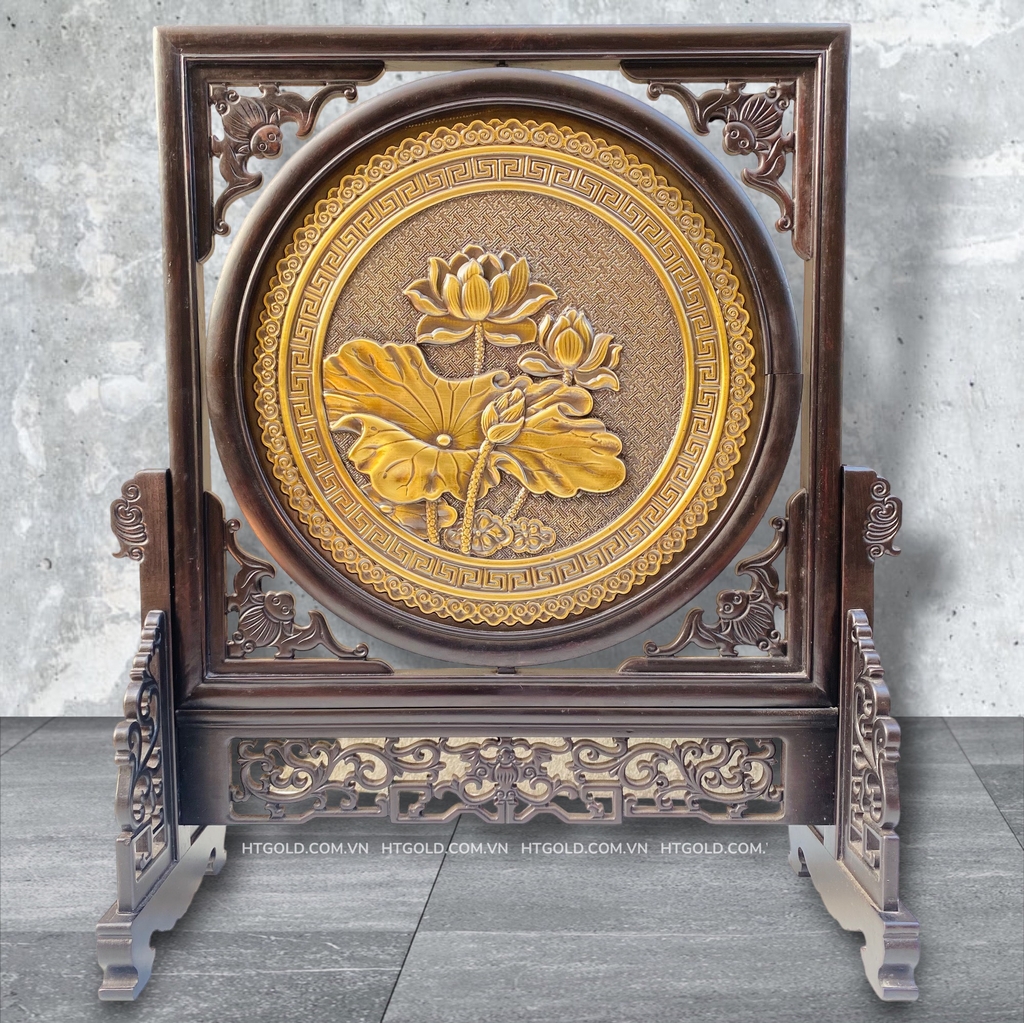 Tranh đồng hoa sen - 2 mặt, giả cổ là loại tranh để bàn có thiết kế độc đáo. Đây là tác phẩm tranh đồng mỹ nghệ cao cấp, thể hiện sự tài ba của người nghệ nhân chế tác tranh đồng thủ công. Tranh được hoàn thiện tinh xảo, sắc nét, hoa văn thúc nổi khỏe khoắn, sử dụng chất liệu vô cùng dày dặn và bền bỉ.
