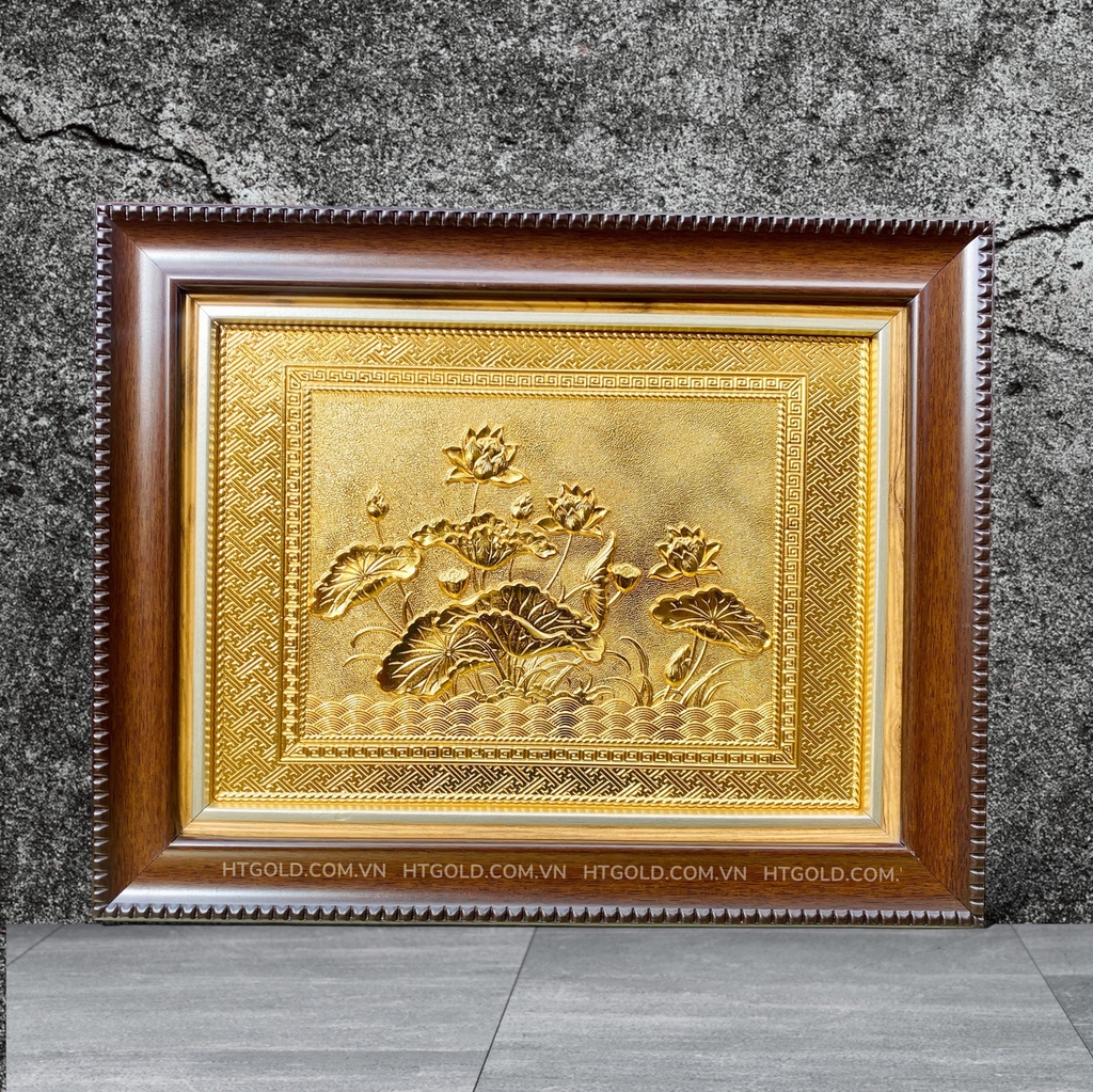 Bức tranh đồng Hoa sen mạ vàng kích thước 28cm x 34cm của HTgold với những đường nét rất tinh xảo và độc đáo được chế tác từ nguyên liệu đồng vàng nguyên tấm và bề mặt được phủ một lớp vàng 24k bằng phương pháp mạ điện phân hiện đại. Sự thanh tao, tinh khiết của hoa sen kết hợp với lớp vàng sang trọng càng nâng tầm giá trị của món quà tặng tranh đồng hoa sen mạ vàng cũng như tấm lòng vàng của người tặng đối với người nhận.